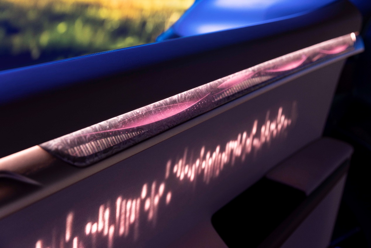 mini-LED直显与超大面积的嵌饰板相融,能在复杂曲面上实现清晰的显示效果及动态灯效;整舱悬浮氛围灯光采用LED灯珠全隐藏式的灯光布局方案,通过对二次光学的理解和开发,达成所想即所见。