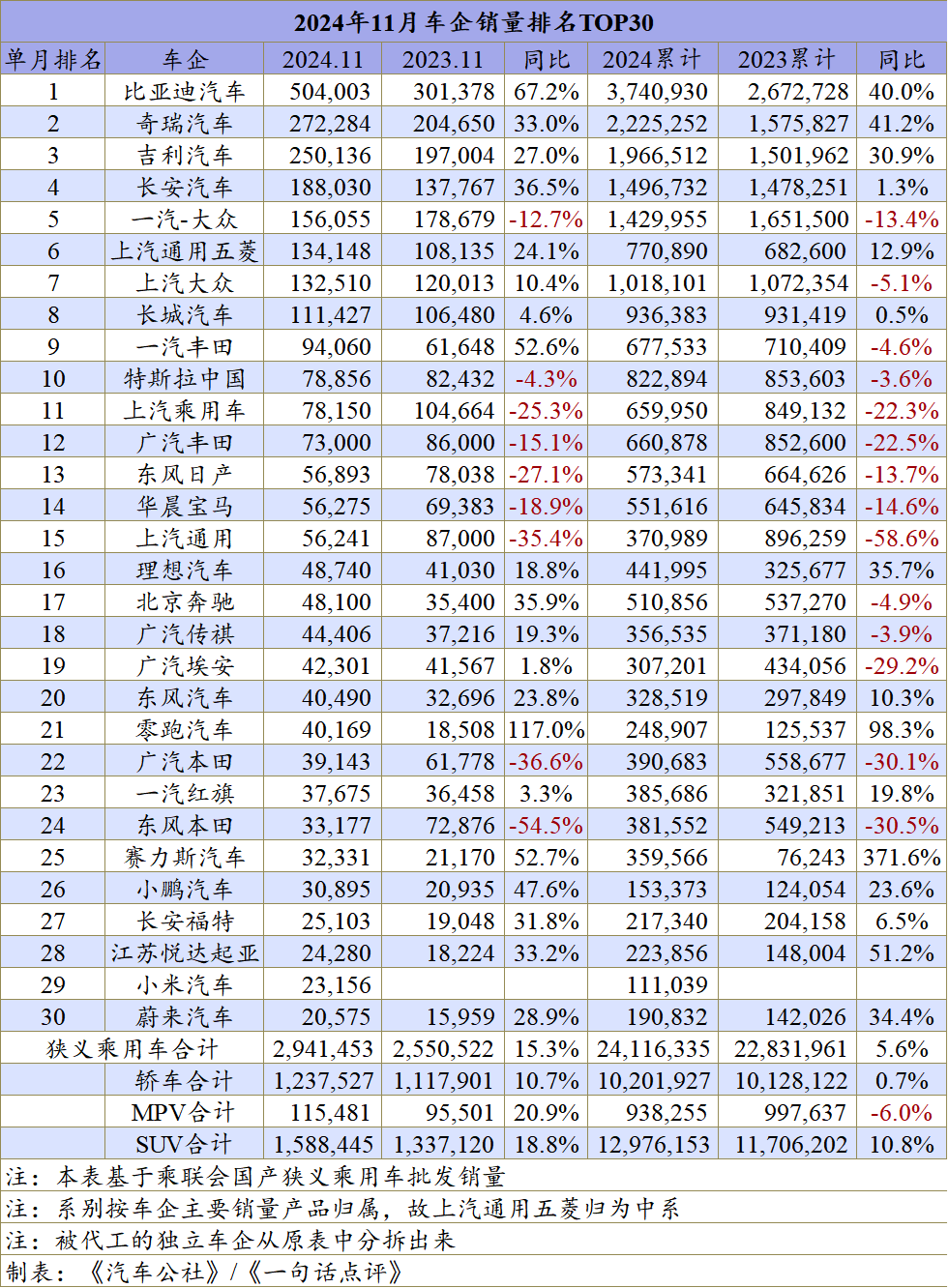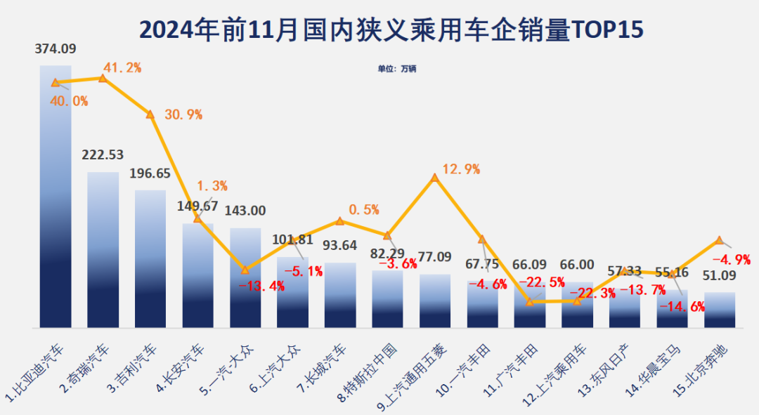 从前11个月的累计销量来看,全年车市的格局基本上已经定了。自主四强领先市场,且销量还在不断增长中,由于各车企间销量差距也比较大,短期内这种局面非常难打破。但同时,市场和消费需求的此消彼长,让还在榜单中的合资车企,压力变得更大了,比如今年前11个月,南北大众、特斯拉、丰田、日产、奔驰宝马等,都没有守住正增长曲线。