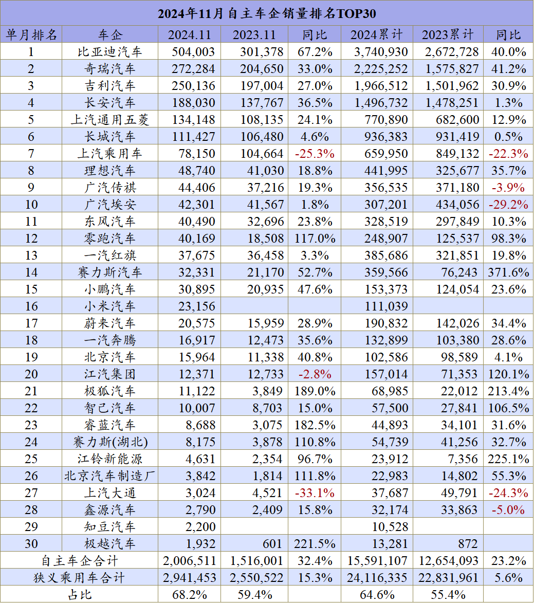 如果从系别销量来看的话,自主的增长确实凭借新能源的快速反应,夯实了基础。11月份自主车企的市场份额达到68.2%,推动前11个月的市场份额高达64.6%,今年自主车企的市场份额有望达到65%的水平。