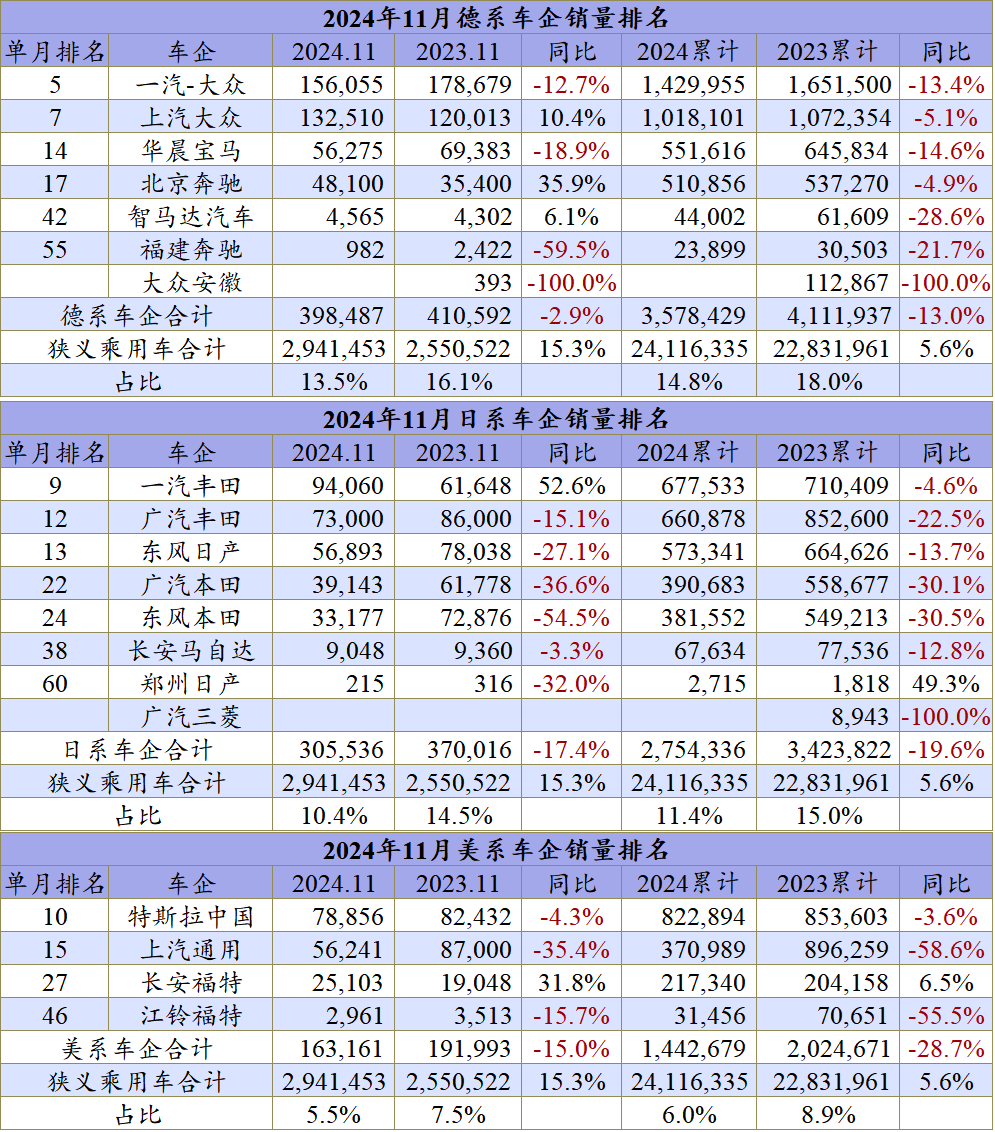 外资品牌份额被压缩是不争的事实,11月份德系的份额被压缩到只有13.5%,全年德系份额将被压缩到15%以内。日系品牌11月份的份额被压到10.4%,如果日系还不尽快崛起,跌破10%也不无可能。美系品牌由于车企不多,在上汽通用摆烂之后,也仅有特斯拉能够撑一撑门面,11月的份额只有5.5%,全年份额仅有6%左右。