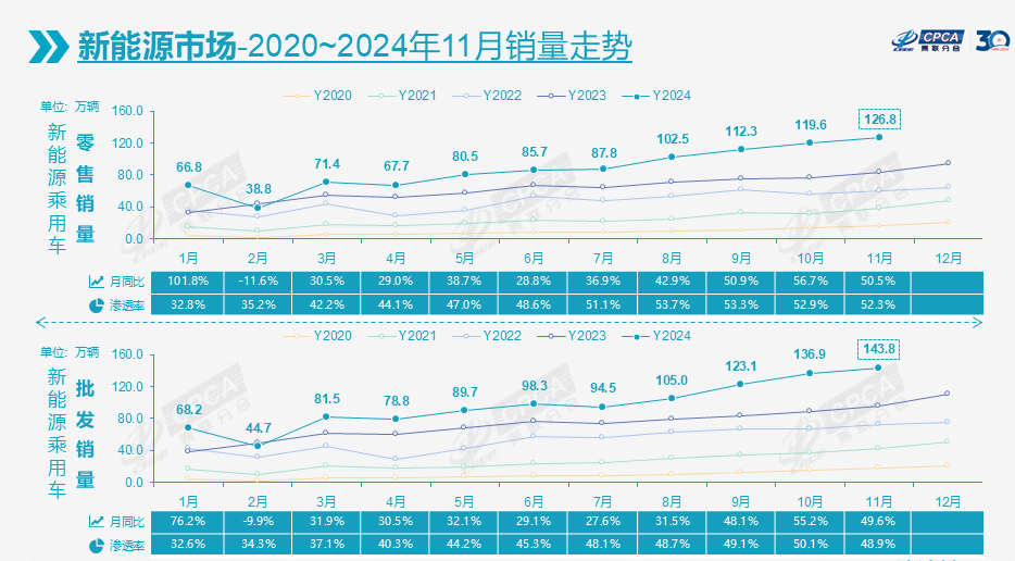 由于国内零售市场的新能源渗透率已连续第5个月超过50%,其实今年前11个月的新能源累计渗透率也增加至47.4%,这意味着全年的渗透率大概率会达到48%左右。