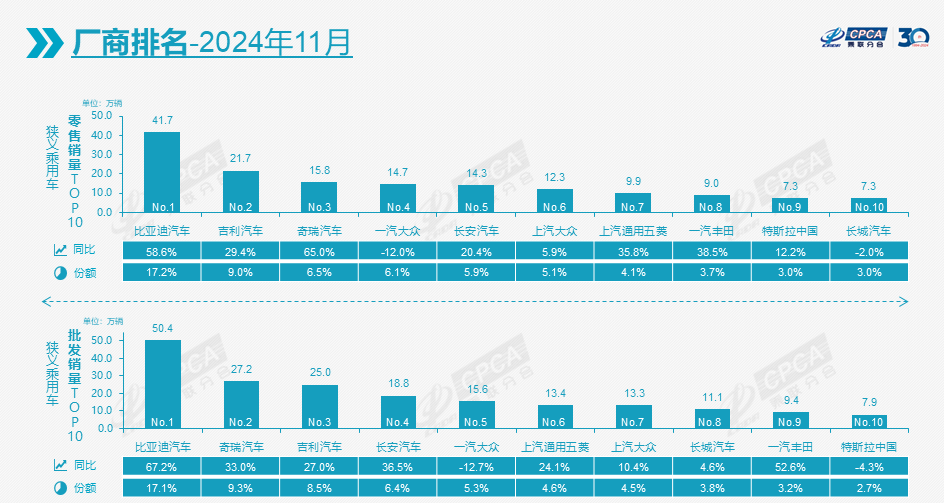 自主品牌,尤其是头部车企们的出色表现,可以在11月车企的零售和批发销量十强的榜单中得到证实。