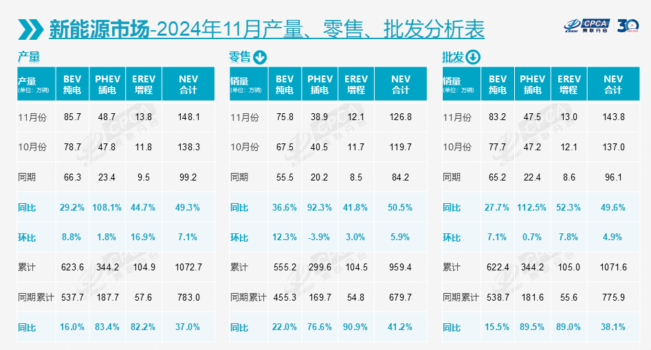 虽然如此,但新能源市场的表现其实并不差,零售与批发销量双双再度创下单月历史新纪录。比如,11月国内新能源零售销量同比增长50.5%至126.8万辆,其中纯电增长36.6%至75.8万辆,插混增长92.3%至38.9万辆,增程式增长41.8%至12.1万辆。