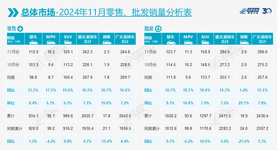 在11月的强劲拉动下,今年前11月我国狭义乘用车零售累计销量达到2025.7万辆,累计同比增幅进一步扩大至4.7%。