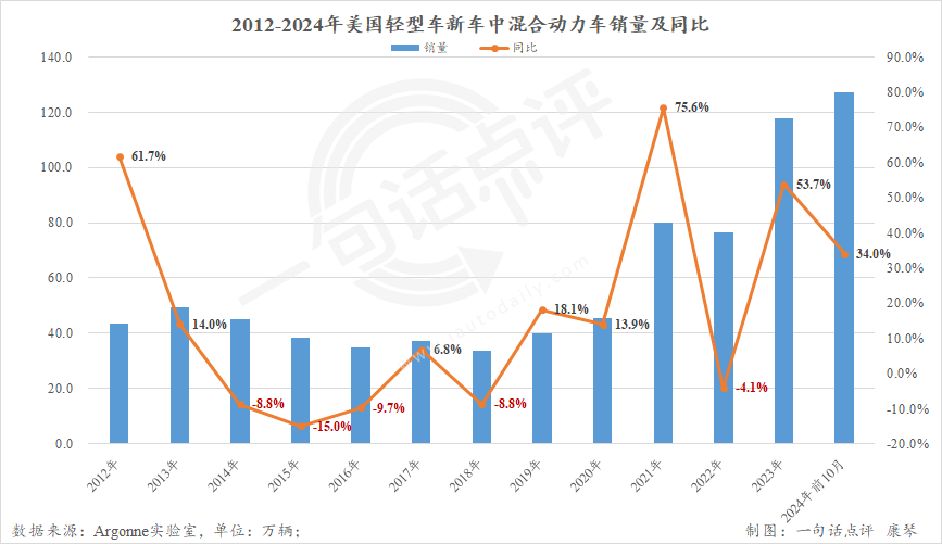 正是在这些车企的共同努力下,根据Argonne实验室公布的前10月的数据(11月暂未出炉),今年2月起今年美国的混合动力车的月销就稳定在10万辆以上,前10个月美国的混合动力车的总销量已达到127.3万辆,已略高于纯电与插混之和的127.0万辆。