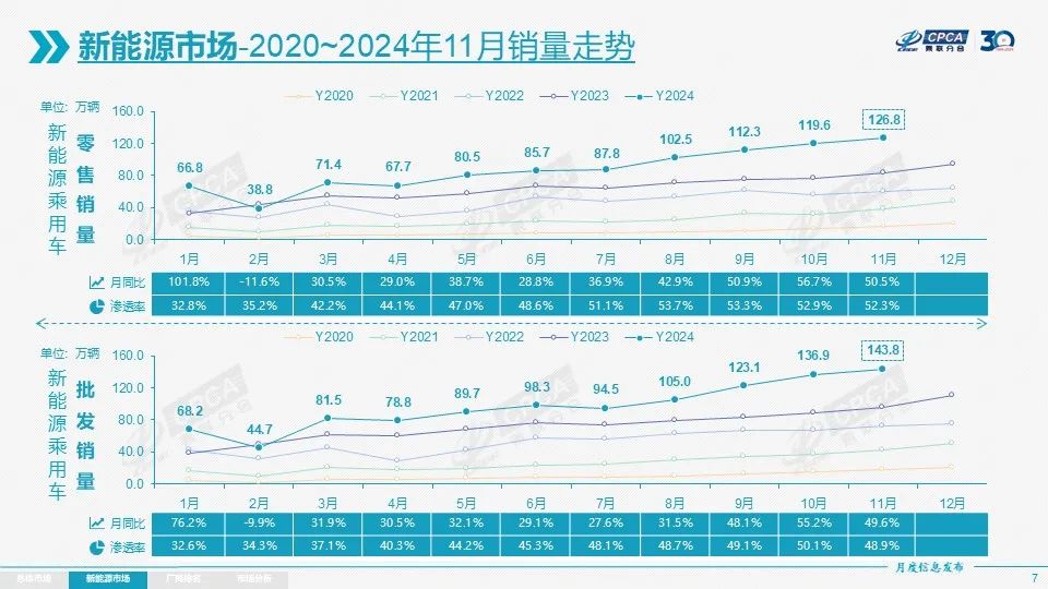 11月,新能源乘用车零售销量达到126.8万辆,同比增长50.5%,环比增长5.9%。2024年1-11月,新能源乘用车累计零售销量达到959.4万辆,同比增长41.2%。