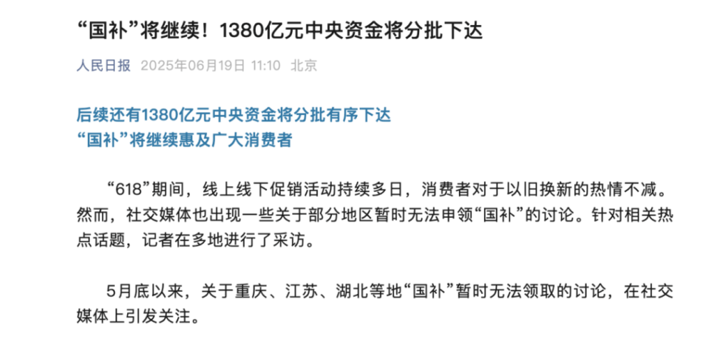 国家发改委、财政部等部委最新回应明确,2025年国家消费品以旧换新补贴政策将持续至12月31日,剩余1380亿元中央资金将在三、四季度分批下达,确保政策平稳落地。