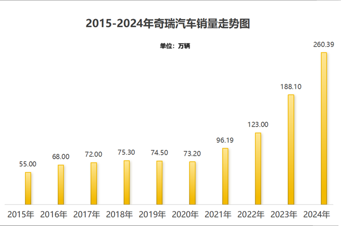 从C-DM到刚刚出炉的C-EM(超级增程),从奇瑞风云再到捷途“纵横”,节节攀升的销量支撑起奇瑞强劲的攻势。2024年,奇瑞集团全年销售汽车达到历史性的 260.3万辆,同比增长 38.4%,创造了年销量的历史新高。这是奇瑞汽车持续第四年的高速增长,从2021年96万辆,2022年123万辆,2024年的260.3万辆,奇瑞汽车已经悄悄攀升到中国汽车总量第五名,自主品牌第二名。出口仍然为奇瑞贡献强大的销量和利润,2024年,奇瑞出口汽车 114.4万辆,同比增长 21.4%。