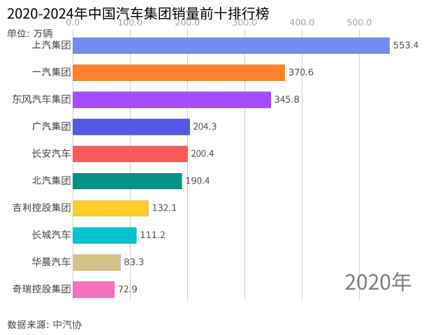 2023年,上汽、中国一汽和比亚迪位居前三名;2024年,比亚迪冲上第一,上汽和中国一汽紧随其后。中国一汽2024年整车销量突破320万辆,相比2023年344万辆同比下滑6%。紧随其后的是长安汽车266万辆,增幅5.1%;第五名奇瑞汽车260万辆,增幅38.4%。