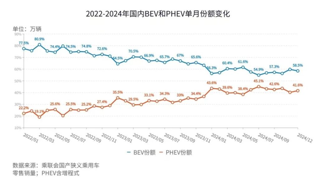 PHEV支持者认为,过往三年PHEV增幅一直快于纯电,照此趋势,2025年将实现对纯电的逆转。2024年,总计1089.9万辆新能源销量中,纯电和PHEV分别销售631.4万辆和458.5万辆,PHEV占新能源比例从三年之前不足15%攀升到去年的42.5%。其中纯电增长22.6%,PHEV增幅为76.8%, PHEV增速是纯电三倍之多。