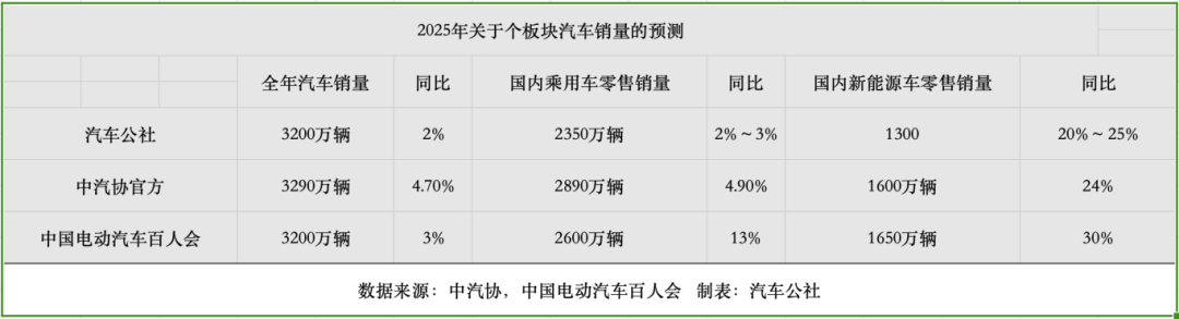 《汽车公社》预计:2025年全年汽车销量3200万辆左右,同比微增2%;国内乘用车零售2350万辆左右,同比微增2~3%;国内新能源乘用车零售1300万辆,增幅从去年40%回落到20~25%。