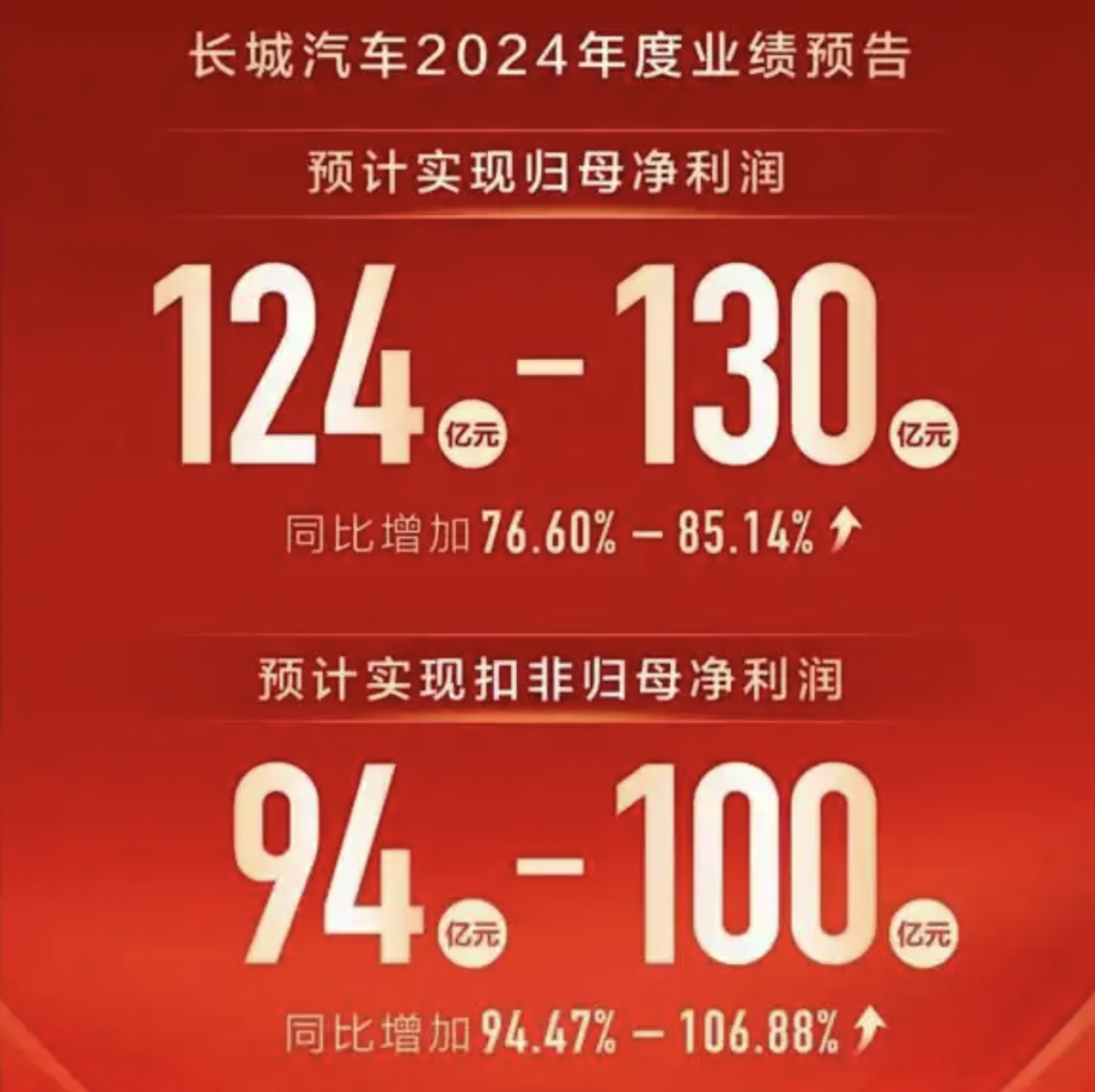 从2024年第一天开始,长城走下价格战牌桌,走上“稳量求利润”之路。1月14日,长城汽车发布2024年度业绩预告:公司销量123.33万台,同比仅增0.21%,但预计实现净利润124亿元到130亿元之间,同比大幅度增加76.60%到85.14%。