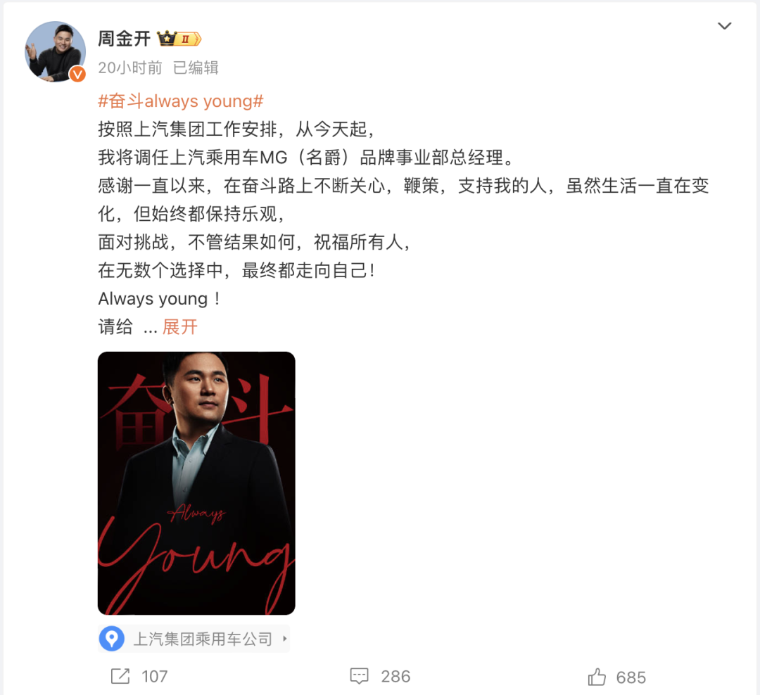 12月9日上午,爱发微博的网友周金开自宣履新上汽的新消息。从这一刻起,他的职位从上汽通用五菱原品牌与传播总经理,变更为上汽名爵品牌事业部总经理。