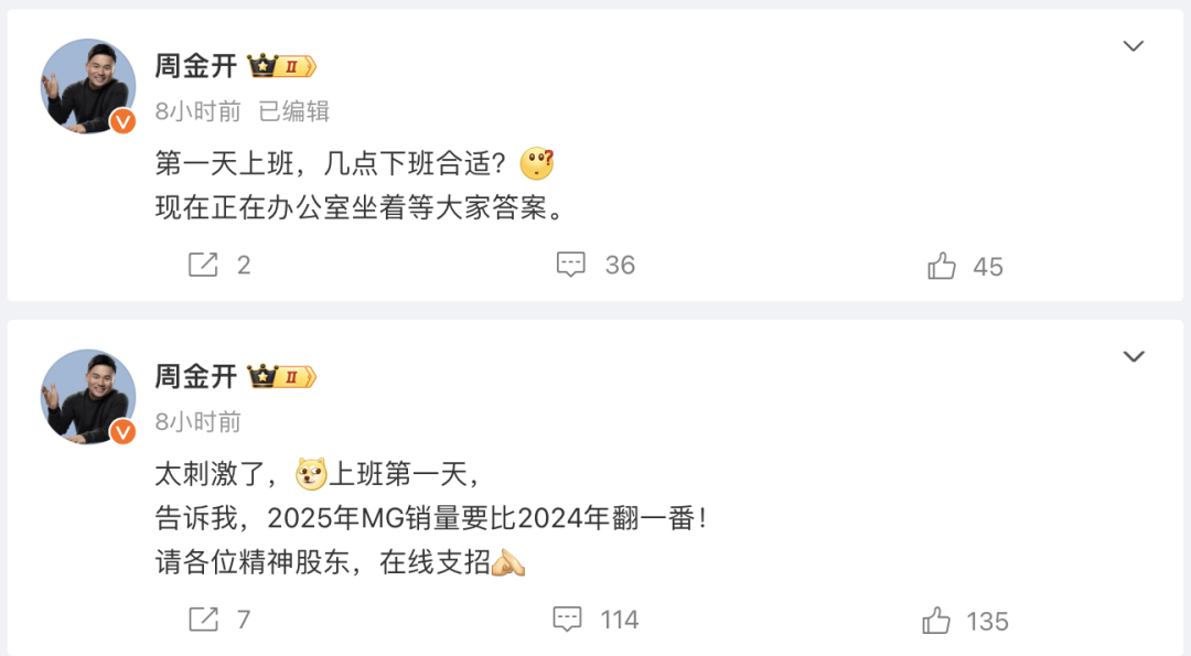 目标很大,压力不小。这让刚来MG上任第一天的周金开有点“慌”。当天晚上八点,周钘发微博表示太刺激了,“上班第一天,告诉我2025年MG销量要比2024年翻一番。”20分钟,他再次按下了微博推送的按键,内容是问大家“第一天上班,几点下班合适。”