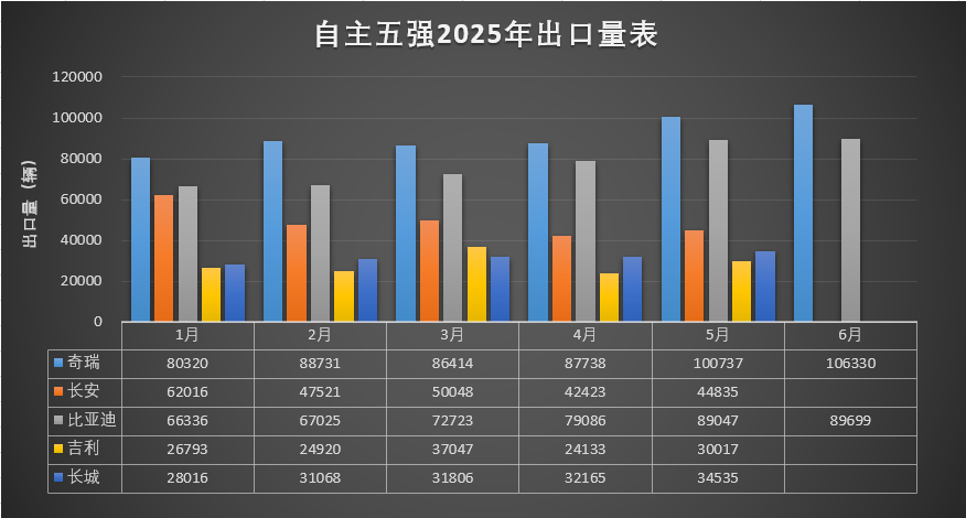 奇瑞6月出口汽车106,330辆,同比增长9.6%。上半年出口汽车550,270辆,同比增长3.3%,蝉联中国车企出口第一。不过,我们也能看到,排在第二的比亚迪追赶很快,6月也达到了89699辆。