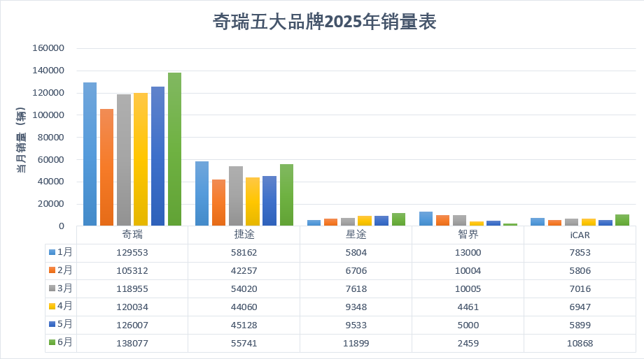 从奇瑞汽车股份有限公司(简称奇瑞汽车)的五大乘用车品牌来看,1~6月业绩都相当不错,共计销售219,044辆,在集团销量中占比93.8%,可谓“各有千秋”。分品牌看: