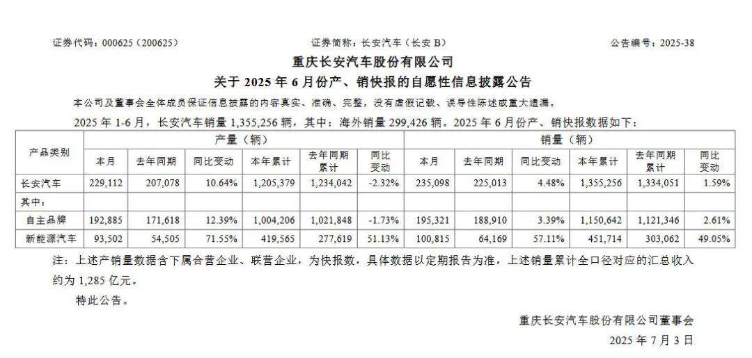 日前,长安汽车公布了6月份及上半年产销数据。2025年1-6月,长安汽车累计销量达135.5万辆,同比增长1.59%。其中,重点突出了海外市场贡献29.94万辆销量。单看6月,长安汽车销量23.50万辆,同比增长4.48%。