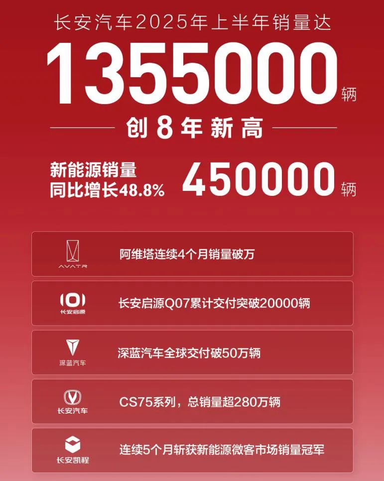 在新能源转型的关键赛道上,长安汽车的销量成果凸显其转型成效。上半年其新能源销量达45万辆,同比增长48.8%,远超行业平均增速。长安启源、深蓝汽车、阿维塔等新能源品牌逐步获得市场认可,为其新能源版图扩张注入强大动力。