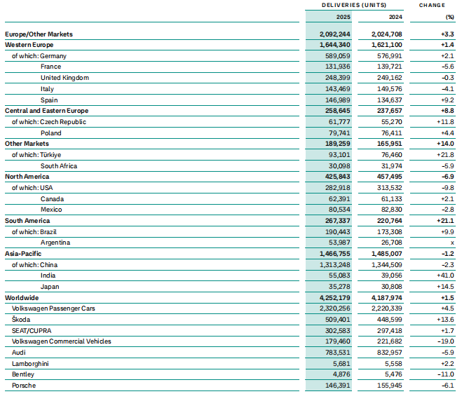 2025年上半年,大众汽车集团在全球范围共销售乘用车与轻型商用车425.2万辆。其中,欧洲大本营稳健,销售209.2万辆,同比增长3.3%;北美市场受挫,销售42.58万辆,同比下滑6.9%,美国高关税无疑是主要拖累;南美意外亮眼,销售26.73万辆,同比大增21.1%,成为增速最快的区域;亚太区域整体承压,整体销售146.68万辆,同比下降1.2%。