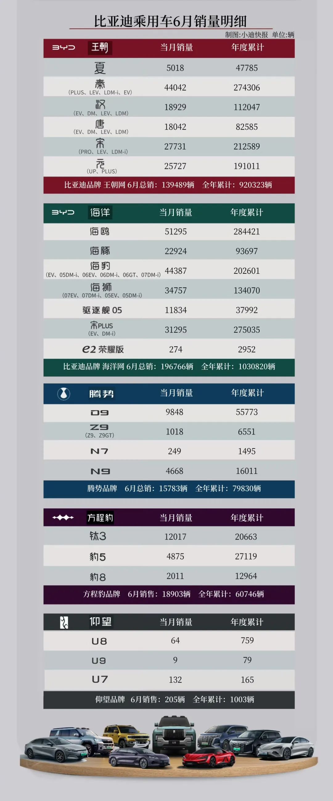 包含夏累计共售出新车47,785辆;秦家族(秦PLUS、秦 PLUS EV、秦L DM-i、秦L EV)累计共售出新车274,306辆;汉家族(汉EV、汉DM、汉L EV、汉L DM)累计共售出新车112,047辆;唐家族(唐EV、唐DM、唐L EV、唐L DM)累计共售出新车82,585辆;宋家族(宋PRO、宋L EV、宋L DM-i)累计共售出新车212,589辆;元家族(元UP、元PLUS)共售出新车191,011辆。