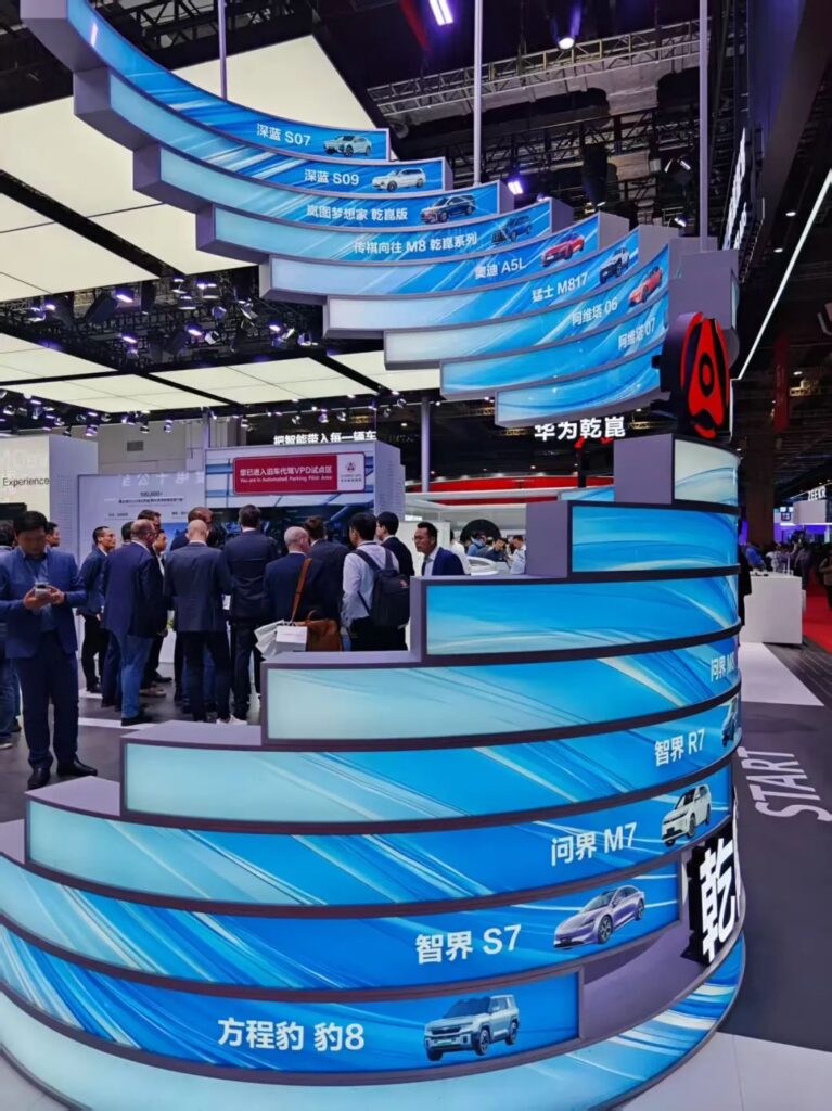 乾崑智能则干脆举办了“集齐11家车企老总”的前夕发布会,并且在车展展台将所有搭载相关技术的车型展示在“环绕台阶”上。
