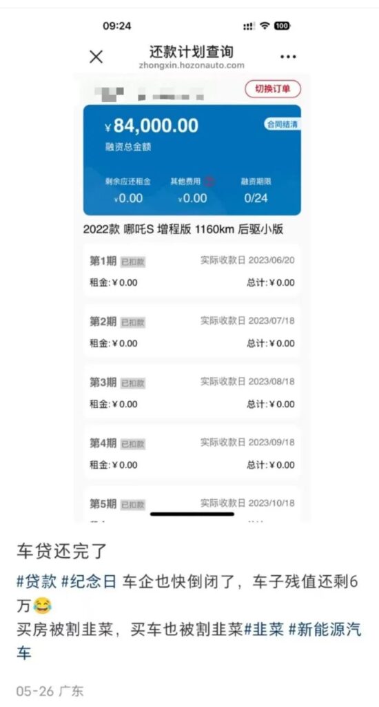 尽管车子贬值严重,维修也需自费,但对于小晚来说,贷款还清的轻松仍带来了喜悦。在《车贷还完了》的记录贴中,他写到:“#车贷#纪念日#车企也快倒闭了,车子残值还剩6万。买房时被割韭菜,买车也被割韭菜#韭菜#新能源汽车”