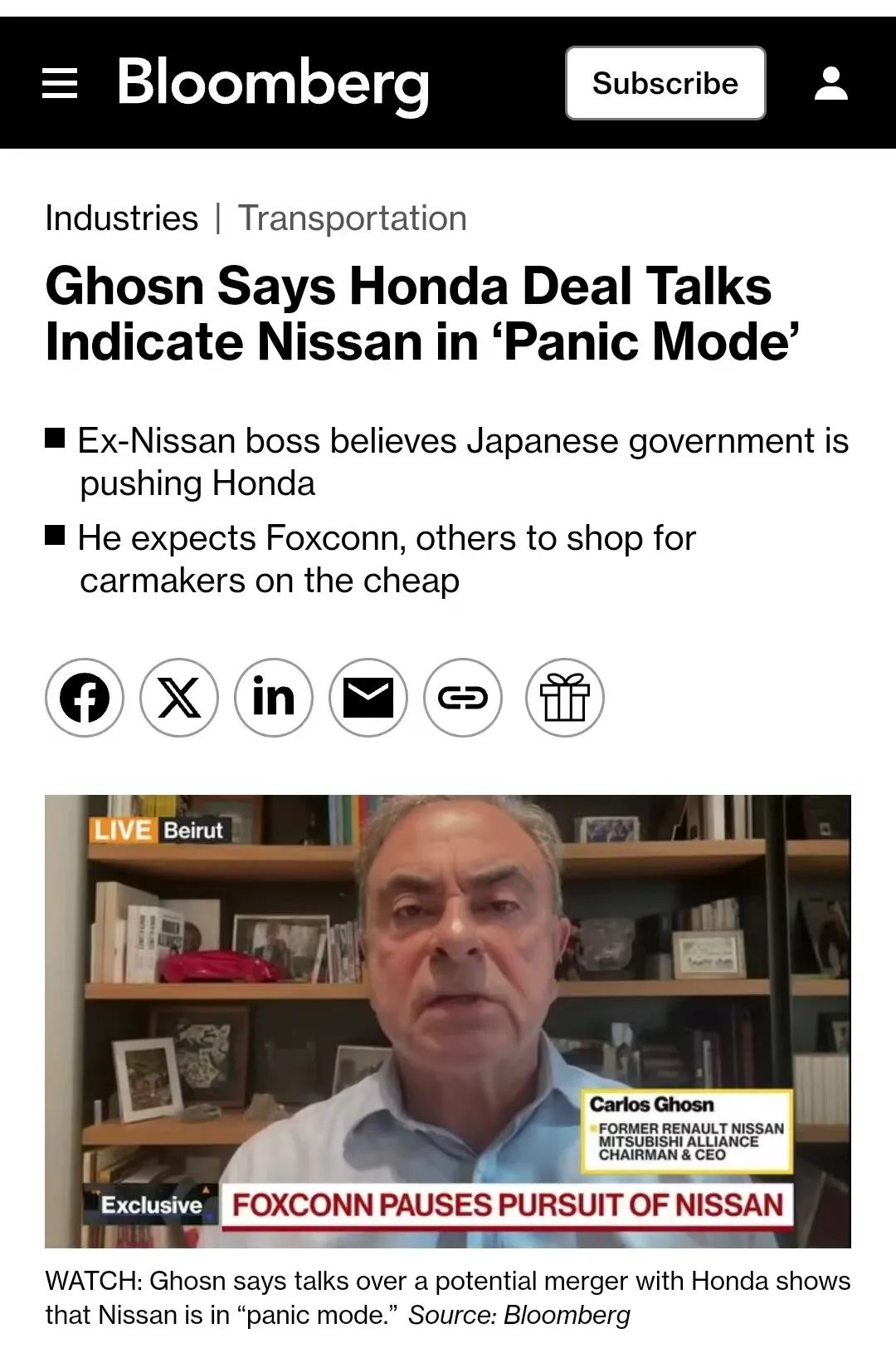 后来,在彭博社的采访中,戈恩又通过视频连线的方式,直言日产已进入“恐慌模式”,且他个人并不看好与本田的合并。