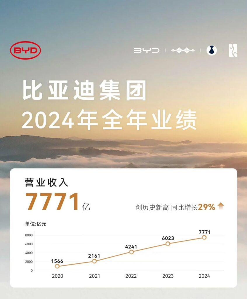 而有了这样的输出作为支撑,2024年比亚迪总营收达到7771亿元,再次创下历史新高。