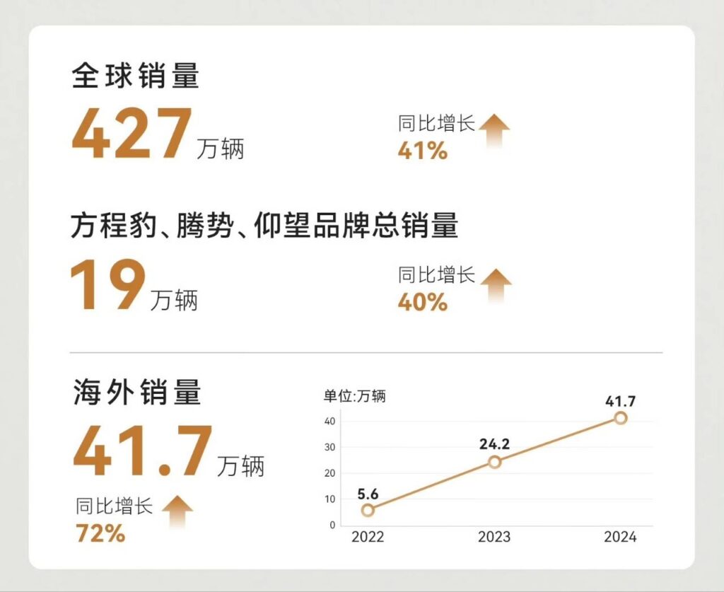 首先,全球销量达到427万辆,同比增长41%。进一步拆分来看,其中方程豹、腾势、仰望三大“冲高”品牌,总销量为19万辆,同比增长40%。
