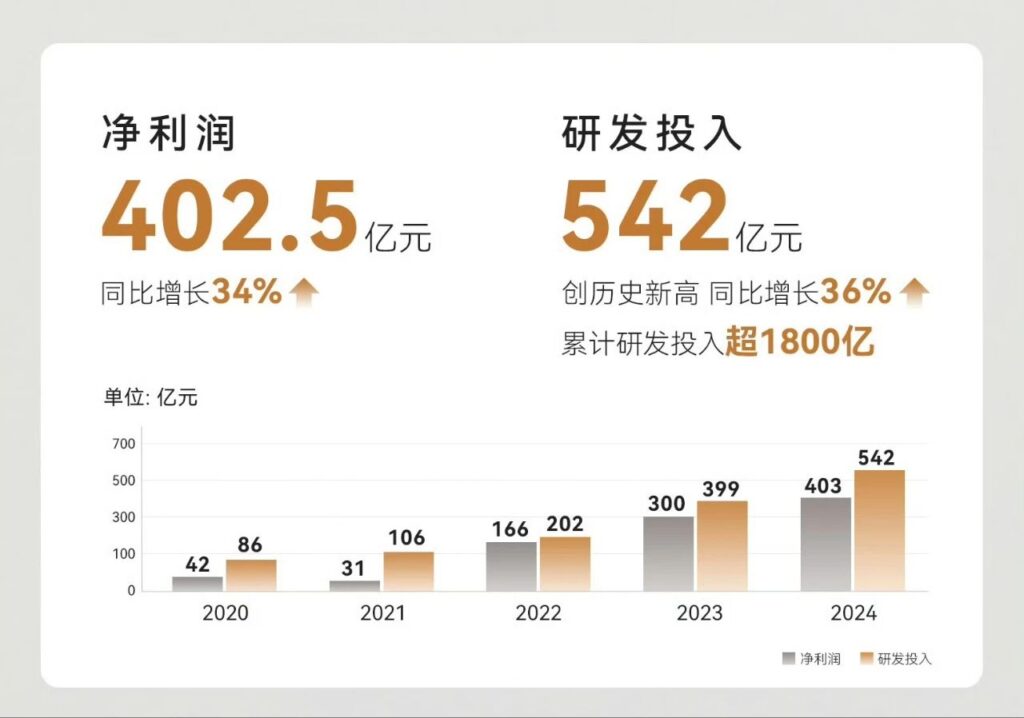 而在研发投入上,同样一骑绝尘,达到542亿元,累计研发投入超1800亿元。