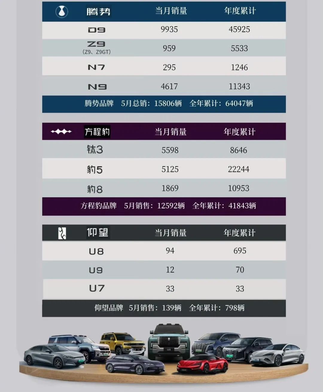 至于仰望,5月共售出新车139辆,包含U8的94辆、U9的12辆、U7的33辆。考虑到均价,也算能够接受。