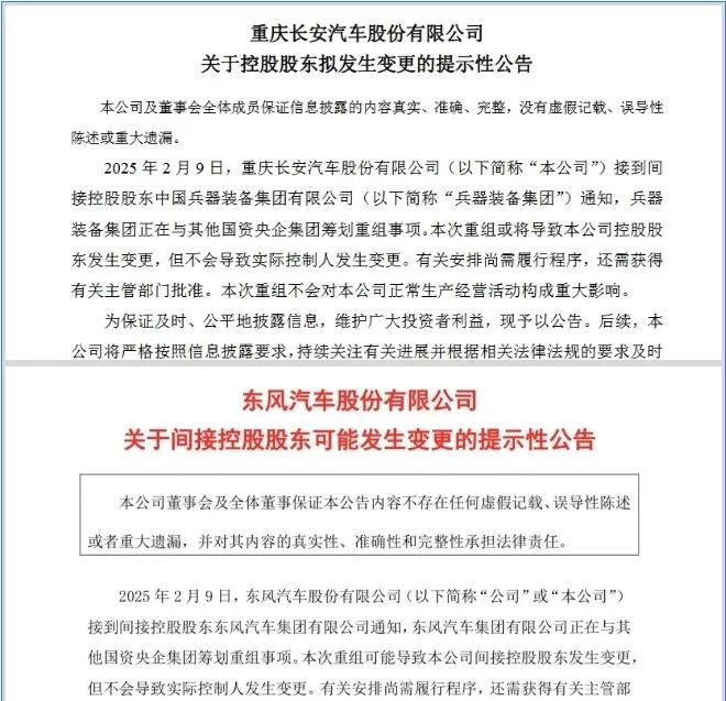 显然,所有人都会觉得这两件事之间存在着一定的关联性。长安汽车和东风的公告均提到其间接控股股东正在与其他国资央企集团筹划重组事项,这表明两家公司的重组活动可能属于同一系列或相关的国有资产整合行动。