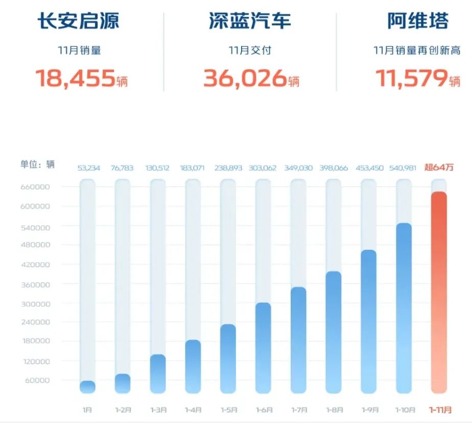 日前,长安汽车发布数据显示,11月,长安汽车新能源销量首破10万辆,1-11月新能源销量突破64万辆。具体品牌来看,长安启源11月销量18455辆,深蓝汽车11月交付36026辆,阿维塔11月销量11579辆。