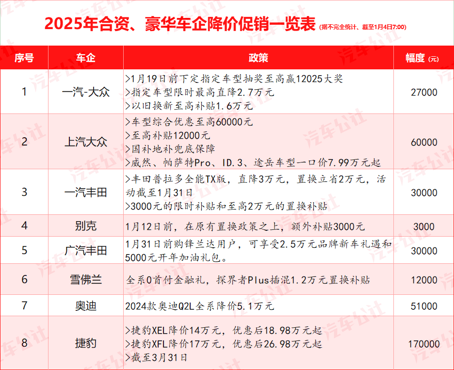 看起来每个节假日、新年伊始或者春节前夕,车市的降价促销都不例外。但相较于过去千元级别的小打小闹,今年开局的促销力度,似乎都不小。特别是在国家和地方以旧换新补贴均已于2024年12月31日到期之际,为积极应对退补带来的影响、稳定1月汽车销量,不少车企开始自行为消费者兜底“续补”。