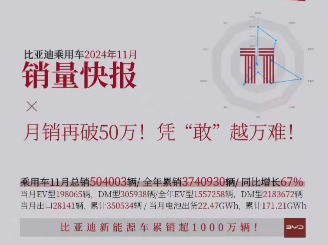 具体来看,11月比亚迪共售出新车506,804辆。其中,共售出乘用车504,003辆,同比增长67.2%。纯电乘用车销量为198,065辆,插混乘用车销量为305,938辆。