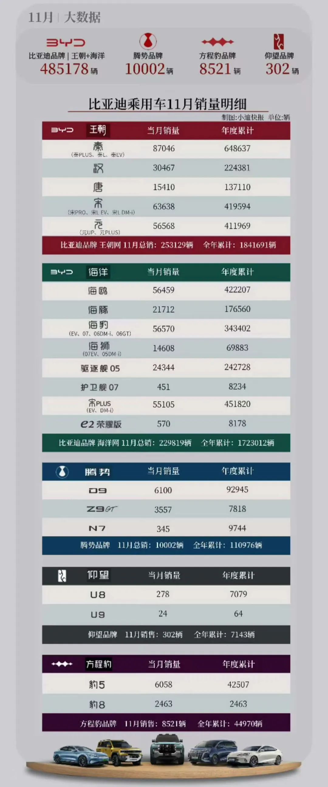 总之,彻彻底底做到了“1+1=2”甚至“1+1>2”的效果。毕竟,11月二者相加的新车销量,便达到了485,178辆。其中,光是月销超5万辆的车型或车系,就有足足6款之多。