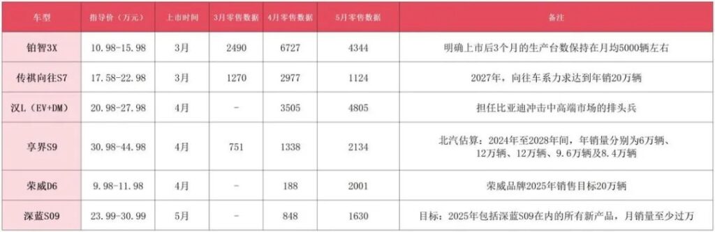可以看到,尽管车市竞争愈发激烈,但正如金子在哪里都会发光,兼具产品力和性价比的产品,即便是刚刚上市的新品,也完全可以在既有车型筑牢的防线中实现突围。然而,迭代加速的市场,能留给新车的时间已然不多,如果上市销量即较为疲软,那么后期冲量的难度也将倍增。近一半车型超预期外,还有多款车型销售不尽如人意甚至月销仅百余辆,背负着极重的销售压力。