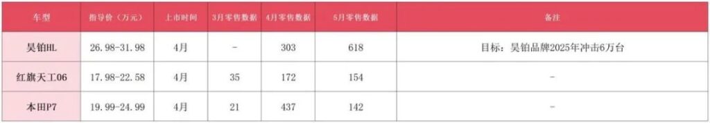 相较于上述与预期目标有一定差距的车型,昊铂HL、红旗天工06、本田P7的销量则较为惨淡,均未超过1000辆。从产品角度而言,三款车型的产品力均无明显短板,有同事上月入手本田P7后,也对其操纵赞赏有加,究其原因,可能是宣传或者是定价有所欠缺。不过,同为4月上市的车型,5月仅为第一个销售完整月,及时调整销售策略,同样不乏“逆袭”的机会。