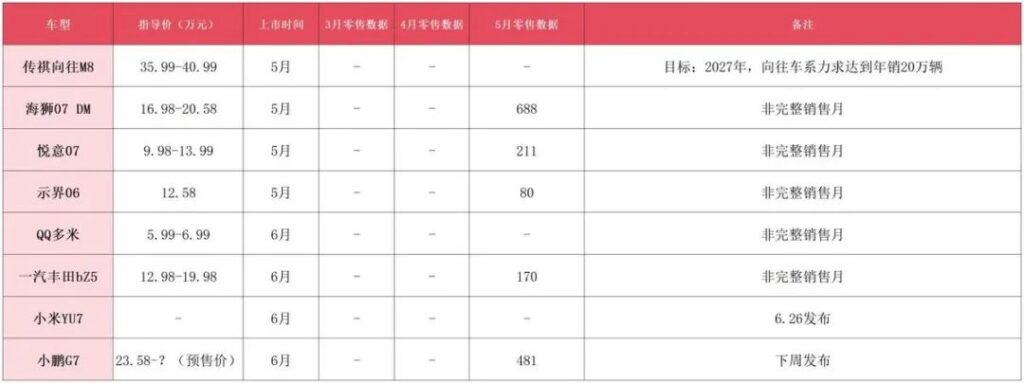 此外,还有海狮07 DM、悦意07、示界06、QQ多米、小鹏G7、一汽丰田bz5等5月或6月新上,还未经历完整销售月的产品,其中也不乏小鹏G7等极具潜力的爆款车型,想要评估其车市大考的最终成绩,还需要让子弹再飞一会。