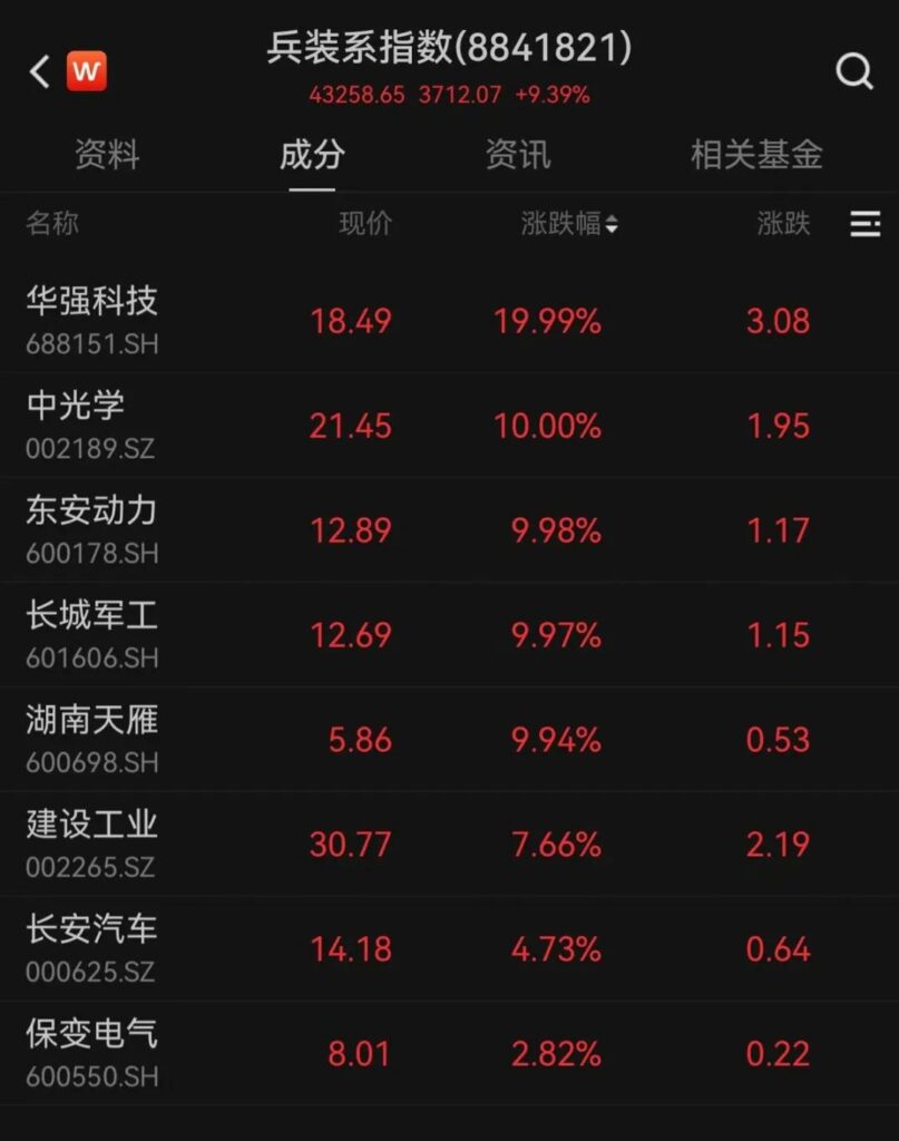 兵装系指数同样快速拉升,东安动力、中光学、长城军工、湖南天雁、华强科技等在早市收盘后涨停并保持至当日收盘。