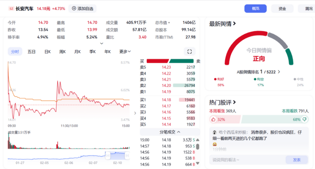 然而,作为当事人之一,长安汽车在8.57%涨幅的高开后,涨幅逐渐收紧回落,截至收盘,其股票价格确定在14.18元/股,仅增长4.73%。