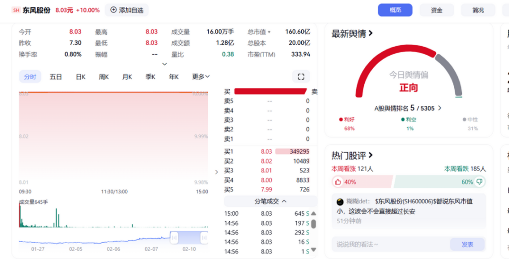 反观东风股份,其股评下又是一番不同的景象:“明天可以买到吗?好想加仓”“就问几个涨停”“长安股价14多,东风要涨到13”“暂时看到20元”。