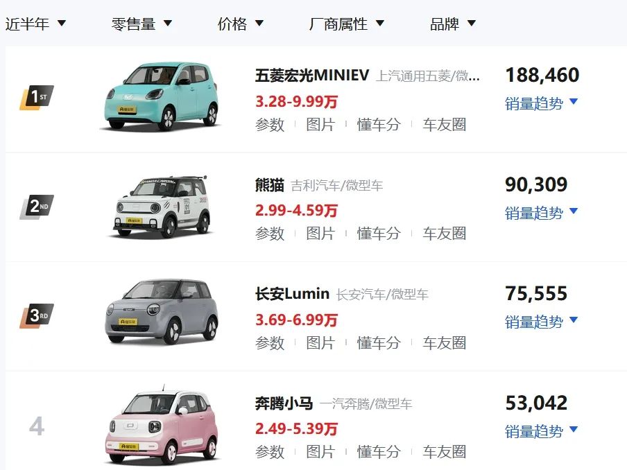 数据显示,最近半年的微型纯电车市场中,五菱宏光MINIEV、吉利熊猫、长安Lumin三款车型市场占有率超50%。奇瑞QQ冰淇淋、奔腾小马虽凭借品牌影响力占据一定份额,但市场表现远不及头部产品。