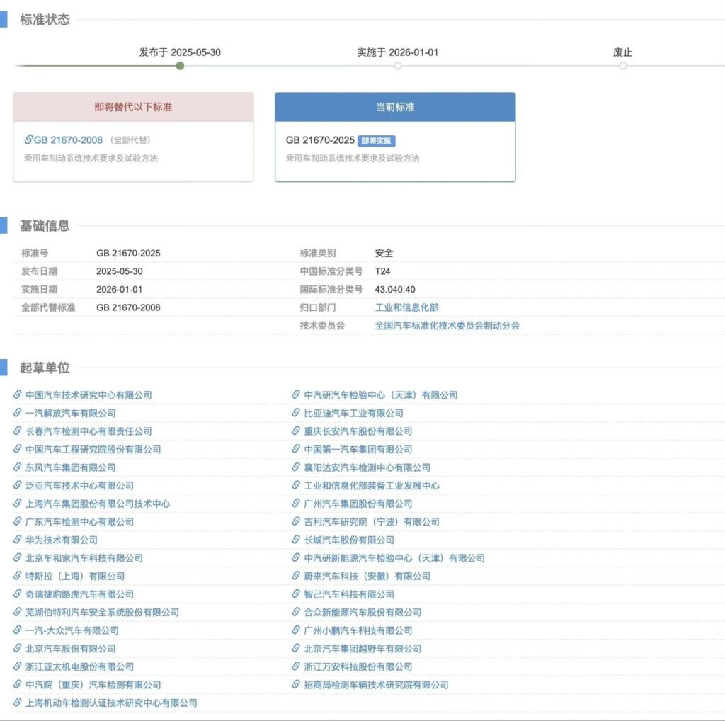就在刚刚,国家标准化管理委员会正式发布《乘用车制动系统技术要求及试验方法》强制性国家标准,该标准将从2026年1月1日起正式实施。