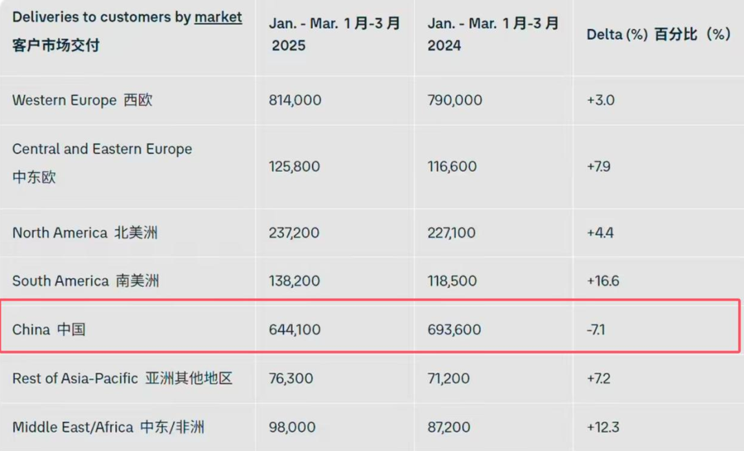 利润的表现和销量有着正相关的关系,因此,从不同市场的销量表现也能看出大众集团2025年一季度财报表现的端倪。