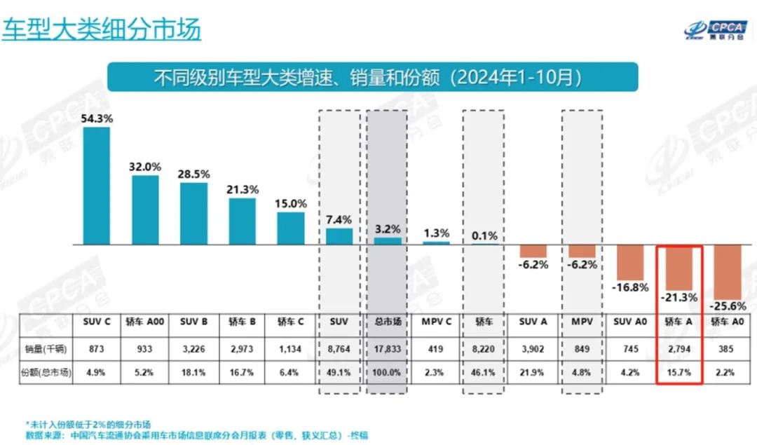 来自前乘联会今年前10个月的数据显示,A级轿车累计零售销量为340万辆,同比下滑21.3%,活生生损失掉了70万辆新车,成为几个量大且主流细分市场下滑幅度最大的领域,远远超出整个轿车市场同比持平的幅度。