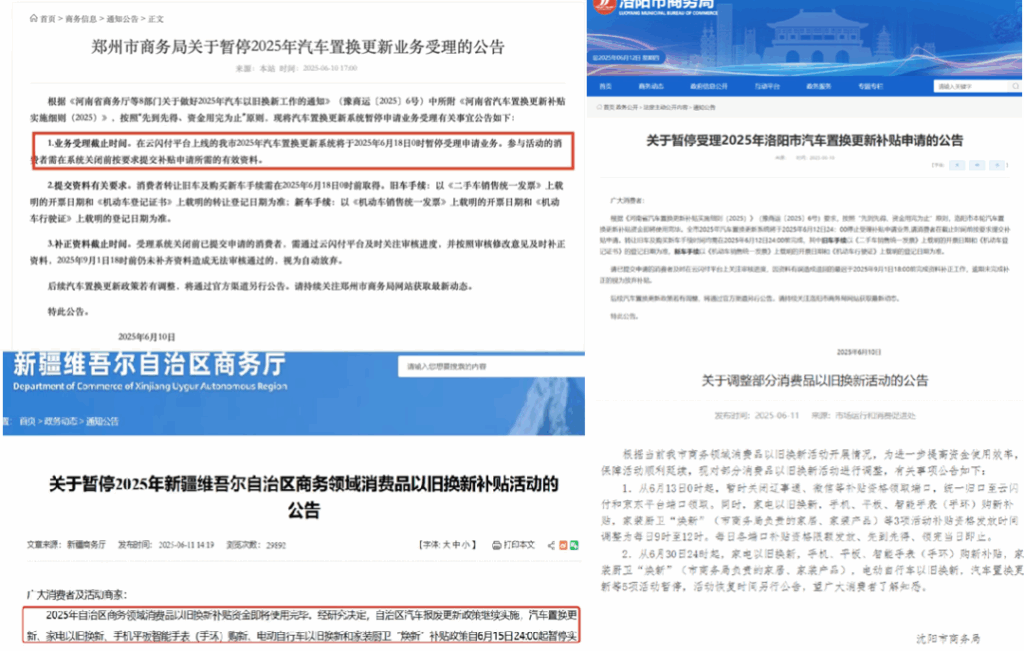 先是河南郑州、洛阳、许昌等地,相继发布公告,宣布暂停受理汽车置换补贴申请业务。其中,郑州于6月18日0时暂停,洛阳于6月12日24:00停止,许昌则在6月13日中午12时停止受理并关闭申请入口。