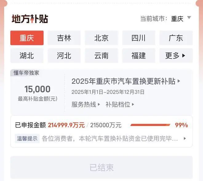 以重庆为例,其2025年汽车置换更新补贴至高补贴1.5万,而目前已申报金额就达21.5亿元,如此庞大的资金支出,在首批资金有限的情况下,很快就导致补贴资金枯竭,不得不暂停补贴受理。