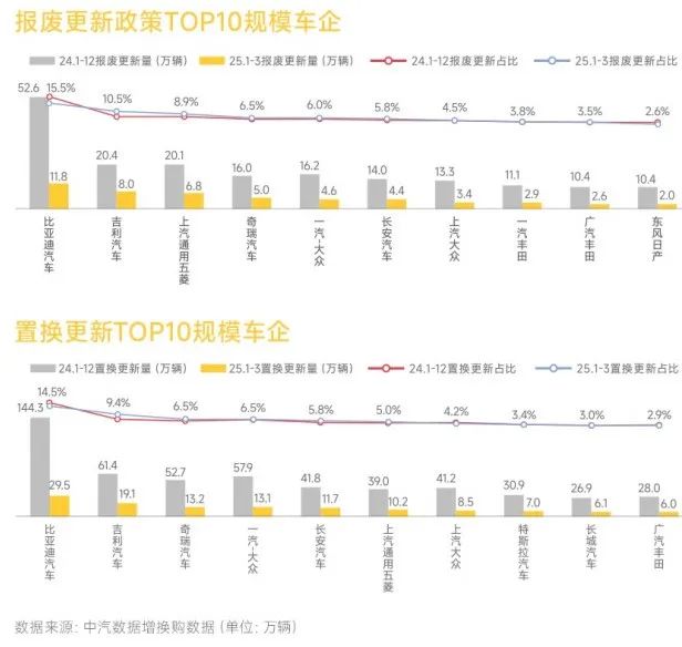 毕竟以旧换新,已经成为目前汽车消费最大的刺激因素了。有数据统计,今年第一季度,全国乘用车“以旧换新”销量达到279.3万辆,同比增长100.2万辆,增幅56%。特别是旧车置换新车占据了大头,203.1万辆,增长53.9万辆;直接报废旧车换新车46.3万辆,增长46.3万辆。