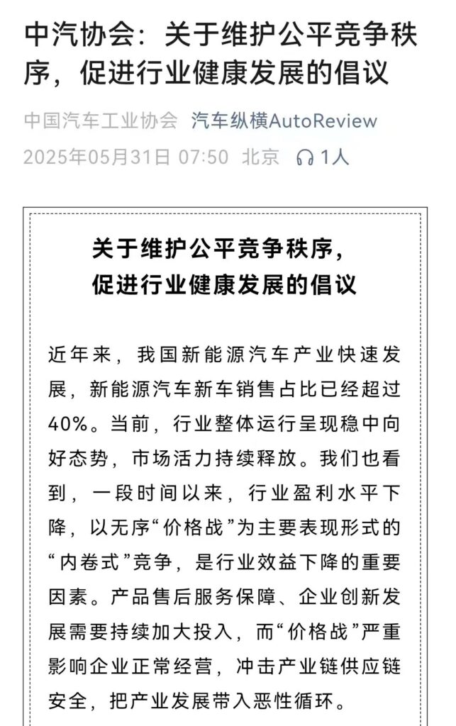 5月31日,中国汽车工业协会发出倡议,反对价格战,维护公平竞争秩序,促进行业健康发展。